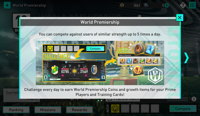 全世界のプレイヤーとの対戦を楽しむことができるモード。 ワールドプレミアシップでは、同Division内のプレイヤーとマッチングされる。対戦報酬として、SP選手や特別練習カードなどの育成アイテム、さらにはアイテム交換用のコインを獲得できる。